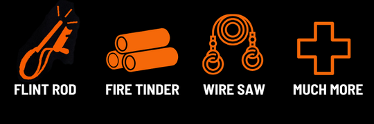 Featuring a large Ferro/Flint Rod, multiple types of Tinder and a Wire-Saw so you can continue to fuel the fire with larger pieces.